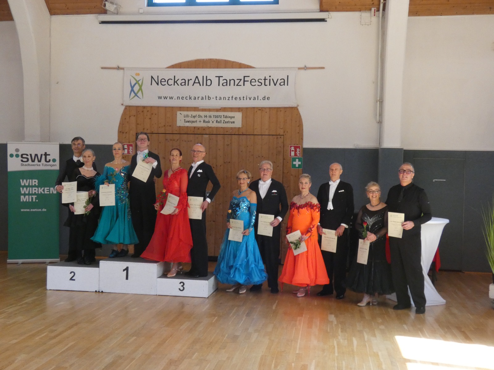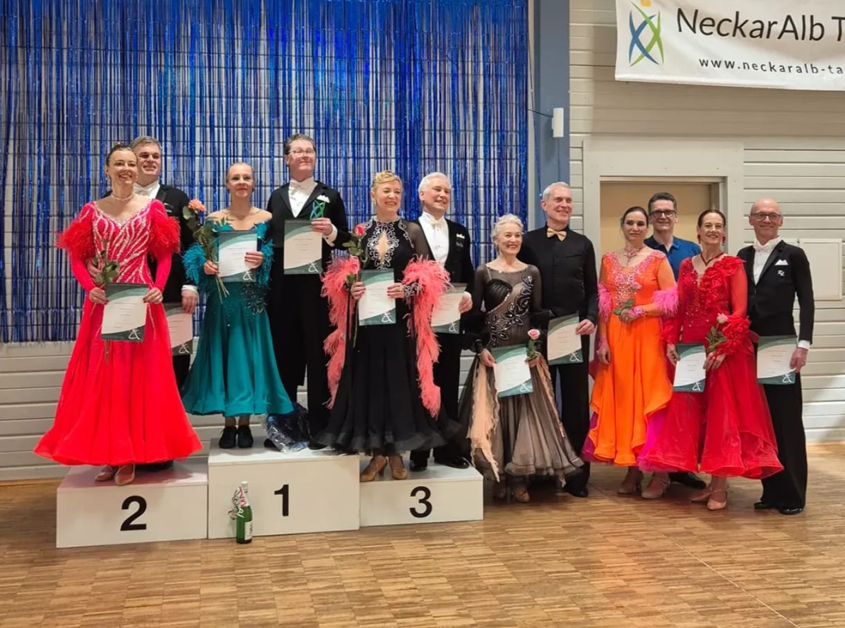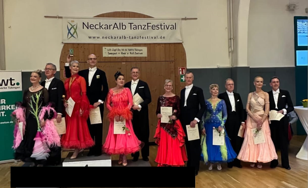 Damit konnte die TSA Schwarz-Gelb Rottweil bereits zum Auftakt des Festivals mehrere Podestplätze und zwei Turniersiege verbuchen. Am zweiten Turniertag in Reutlingen wurden die Wettbewerbe des NeckarAlb Tanzfestival fortgesetzt. In der Startklasse Senioren IV B Standard liegen folgende Ergebnisse vor: Klaus Lehmann und Karin Jakubowski ertanzten sich den dritten Platz, während sich Johannes und Petra Wittmann am zweiten Turniertag sogar auf Rang zwei steigern konnten. In der jüngeren Altersklasse in Senioren III B Standard konnten Ewald Westfal und Michaela Mühlebach-Westfal Platz 2 des Treppchens erklimmen.