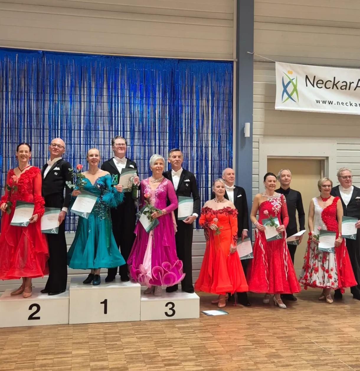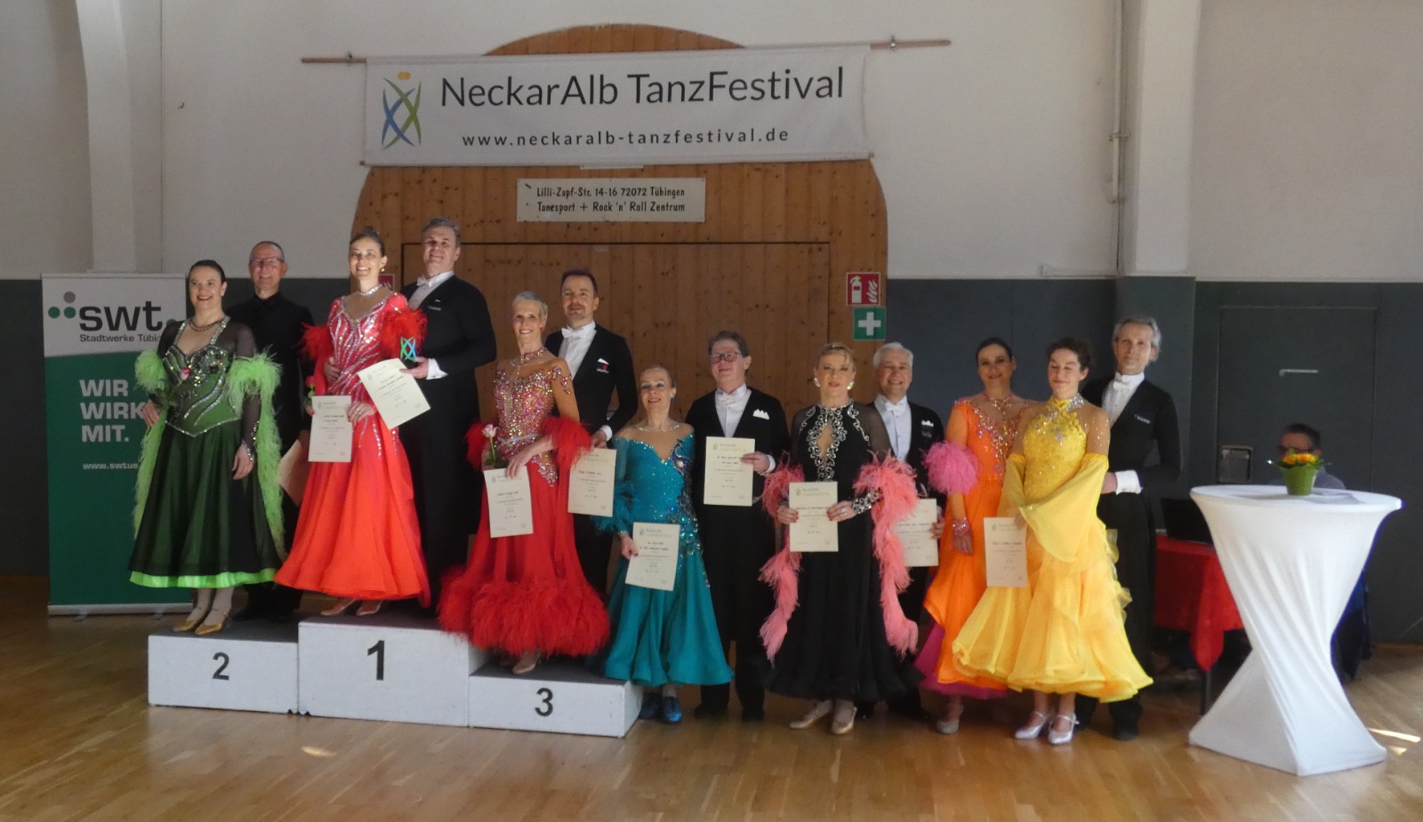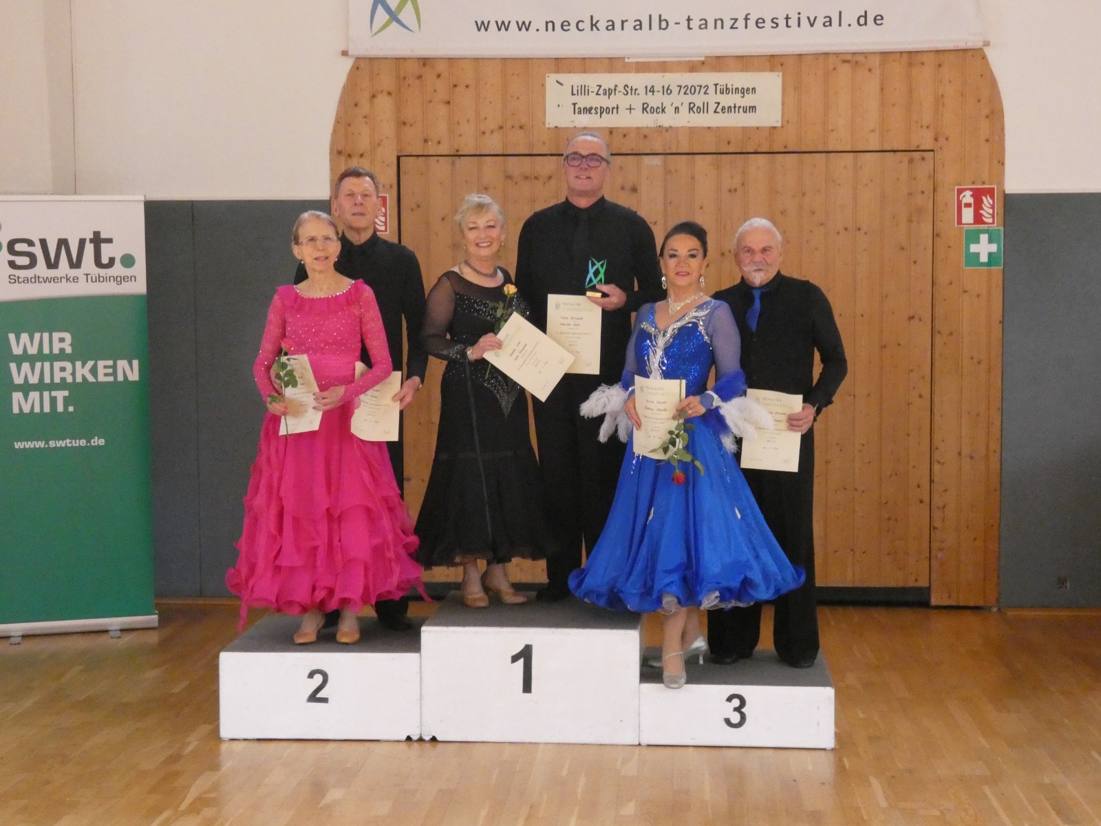 Damit konnte die TSA Schwarz-Gelb Rottweil bereits zum Auftakt des Festivals mehrere Podestplätze und zwei Turniersiege verbuchen. Am zweiten Turniertag in Reutlingen wurden die Wettbewerbe des NeckarAlb Tanzfestival fortgesetzt. In der Startklasse Senioren IV B Standard liegen folgende Ergebnisse vor: Klaus Lehmann und Karin Jakubowski ertanzten sich den dritten Platz, während sich Johannes und Petra Wittmann am zweiten Turniertag sogar auf Rang zwei steigern konnten. In der jüngeren Altersklasse in Senioren III B Standard konnten Ewald Westfal und Michaela Mühlebach-Westfal Platz 2 des Treppchens erklimmen.